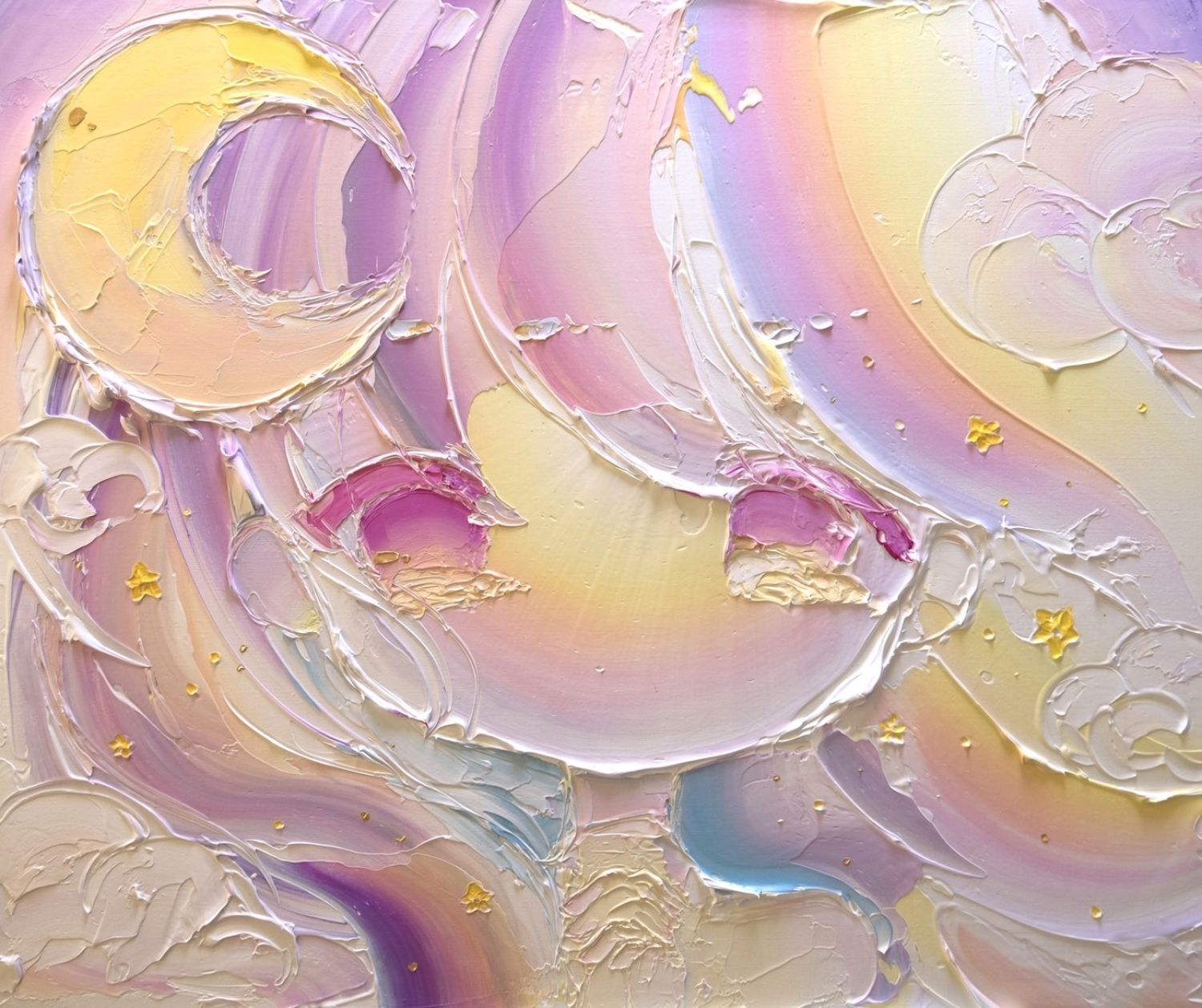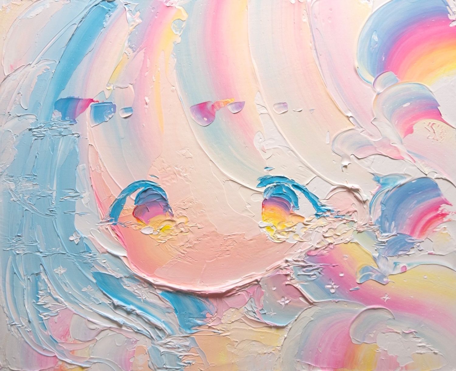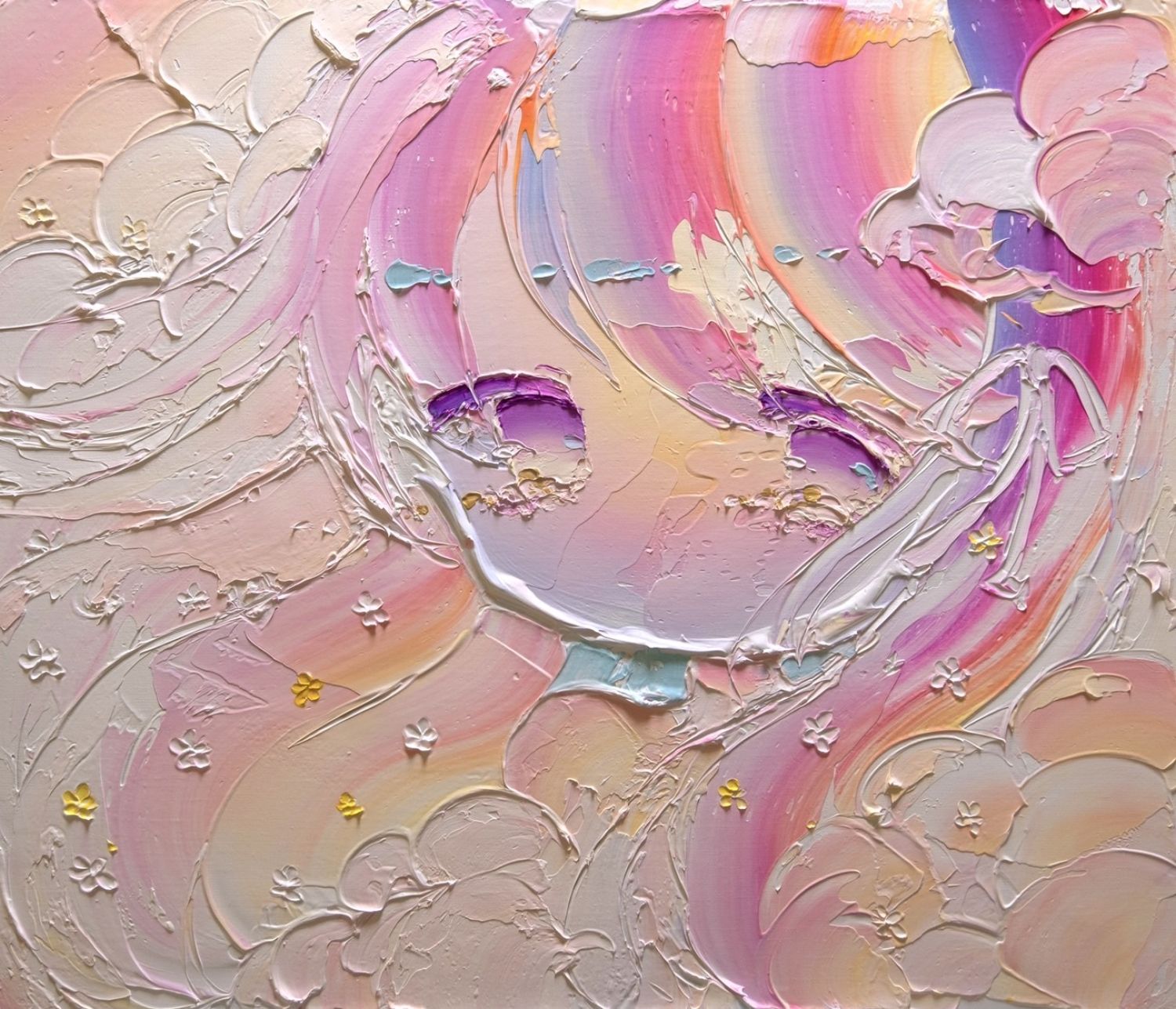 | アクリル絵の具の色彩の濃淡とペインティングナイフのタッチや、混色による抽象的表現を掛け合わせることで、少女の流動的な心のゆらぎや色世界を表現しています。 (By playing with variation of color shades of acrylic paint with the touch of a painting knife, as well as the abstract expressions created by the mixture colors, I try to express the fluctuation of a girl's mind and her vivid and colorful world.) |