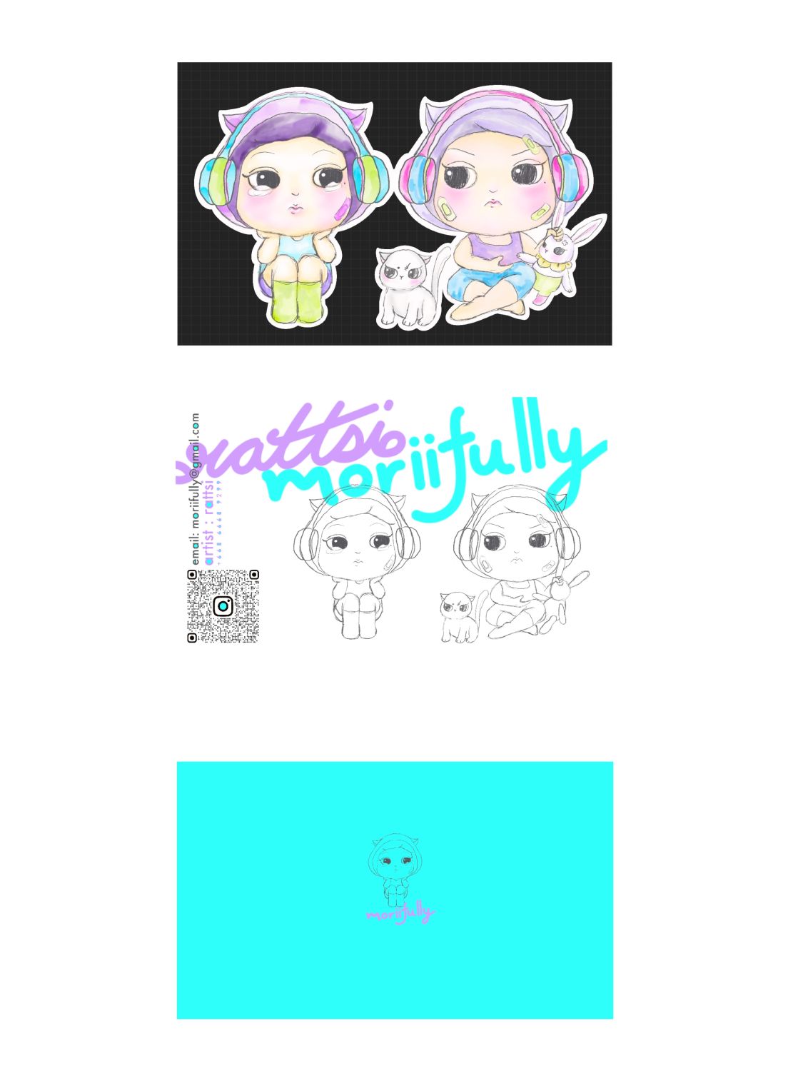 | RattSi is an Artist name of Nawarat Sitthimongkolchai, I’m a teacher of creative design at university, I do graphic design sometimes but I spend a lot of time from teaching. My dream is Artistic and I like to do something cute but present conceptual or my opinions, when I have time I will do my Art. I designed a character named Mori, 'Mori' full name is Moriifully = morii+ willful. Mori the girl with big eyes that express stubbornness but also with sadness, her hair and eyes can change color. Beside Mori, there is always Mamoru. Mamoru is a cat that can change the color of its fur and eyes. Mamoru has a friend named Rin. Rin is a white rabbit (sometimes not white). Rin is Riku's rabbit, but no one has ever met Riku. Note: Mori means forest, Mamoru means guardian, Riku means earth, Rin means friend, Thus, the origin of the word guardian of the forest and friend of the earth. |